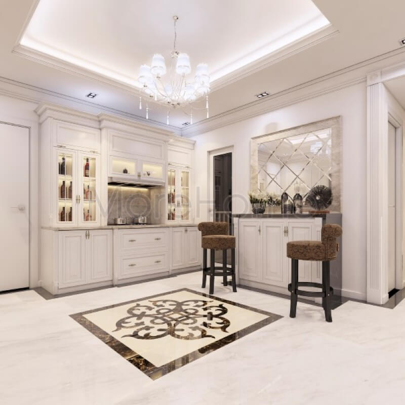 Đá ốp bếp màu trắng vân mây tạo nên vẻ đẹp mềm mại, độc đáo và không kém phần sang trọng cho nội thất phòng bếp