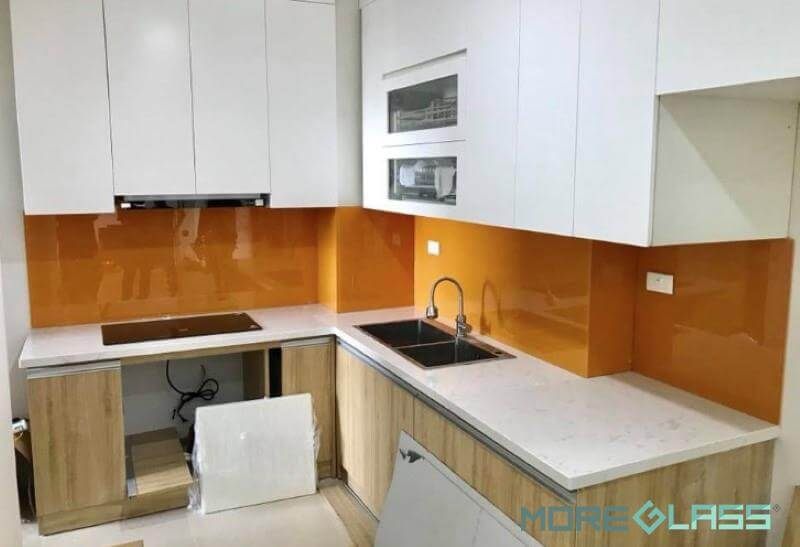 Gia chủ yêu thích sự trẻ trung, muốn không gian nội trợ nổi bật hơn, nên chọn kính ốp bếp có màu vàng như mẫu trên đây mà MoreGlass giới thiệu.