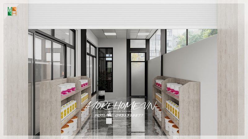 Trang trí khu vực tiếp khách showroom nổi bật, bên cạnh là khu vực trưng bày sản phẩm để khách hàng tham khảo kết hợp khu vực kho bãi rộng tạo nên một không gian nội thất lí lượng