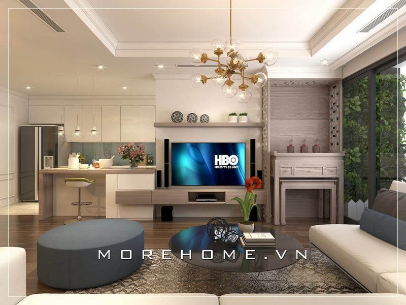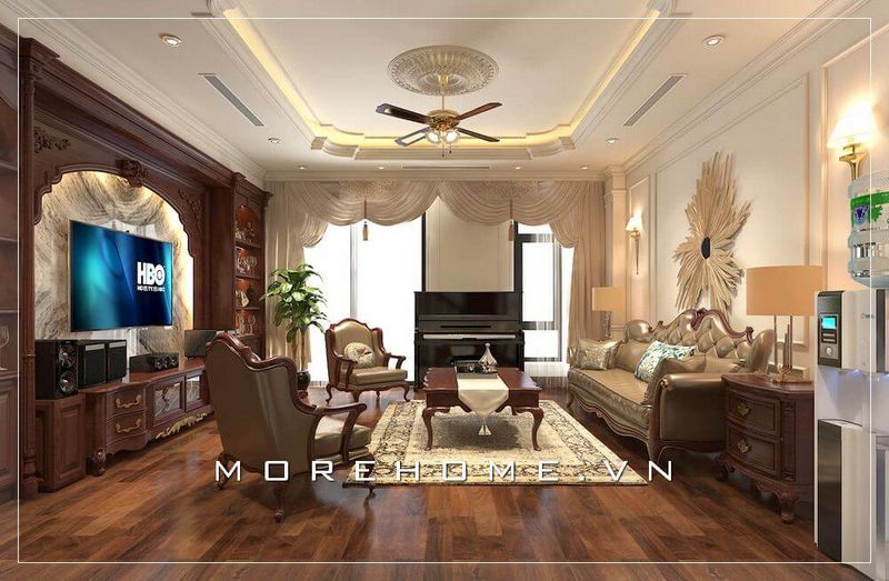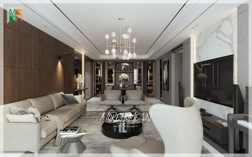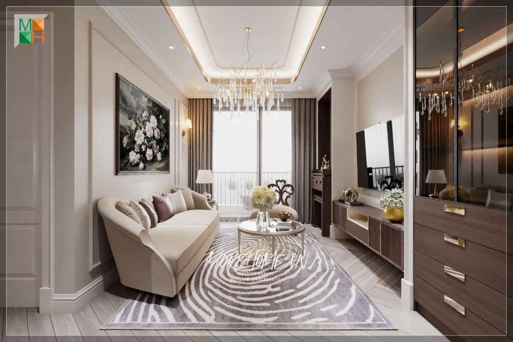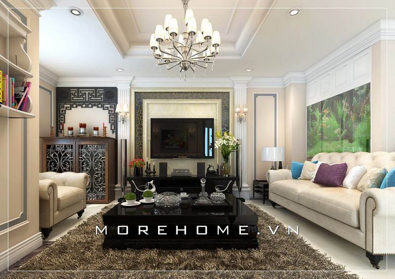 Morehome gợi ý cho bạn mẫu thiết kế nội thất phòng khách chung cư, nhà phố tiện nghi và sang trọng mang phong cách tân cổ điển.