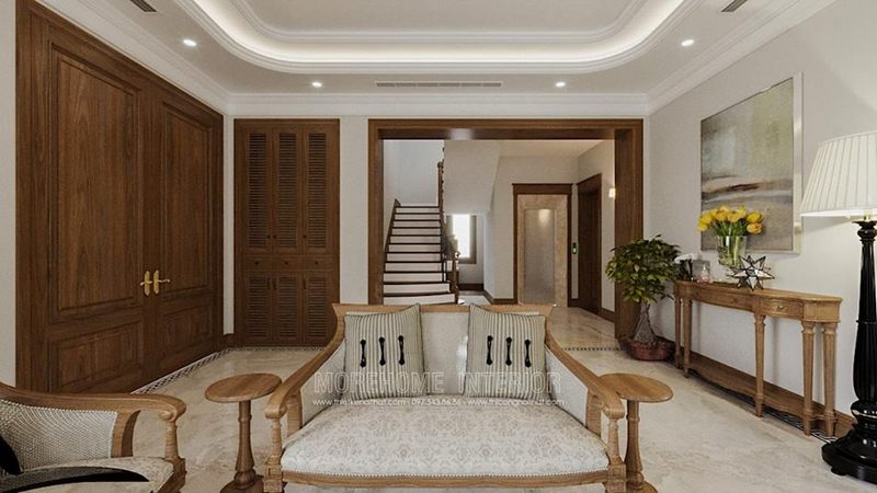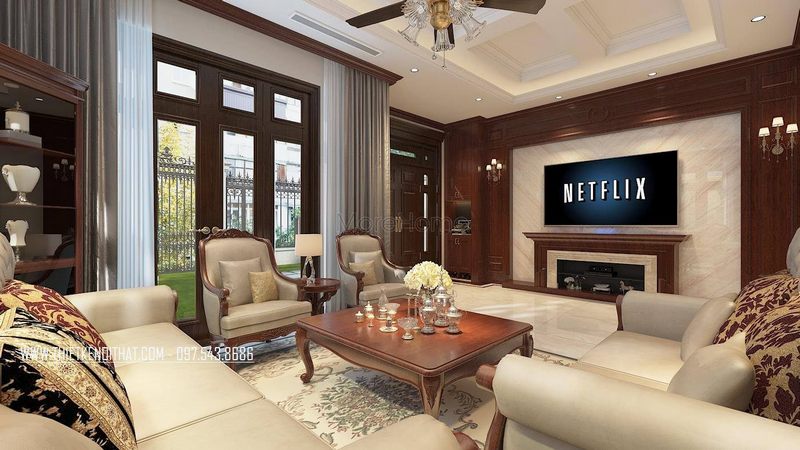Thi công nội thất gỗ phòng khách biệt thự tân cổ điển