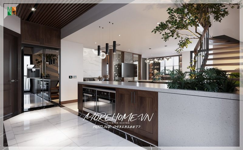 Phối cảnh thiết kế hiện đại đẹp cho biệt thự nhà phố với ý tưởng thiết kế phòng khách liền bếp ăn.