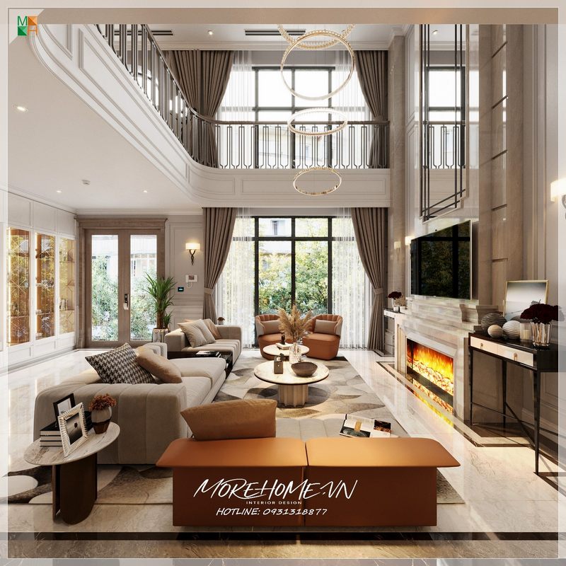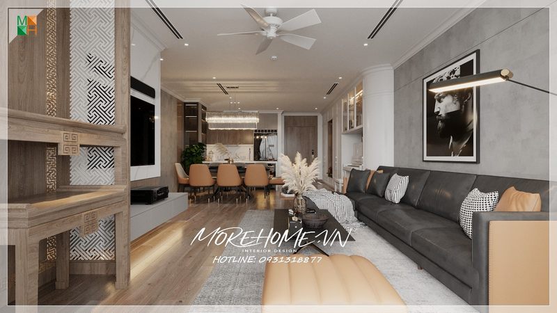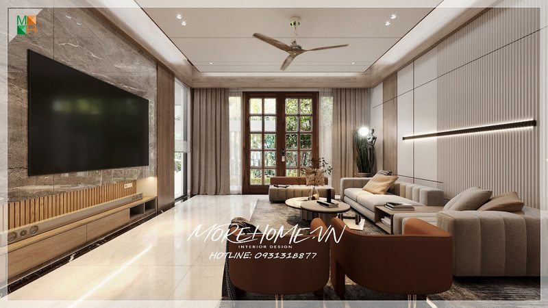 Bàn ghế sofa phòng khách có thiết kế hiện đại kết hợp với bàn trà tạo nên sự hài hòa trong không gian của căn phòng, gây ấn tượng rất tốt.