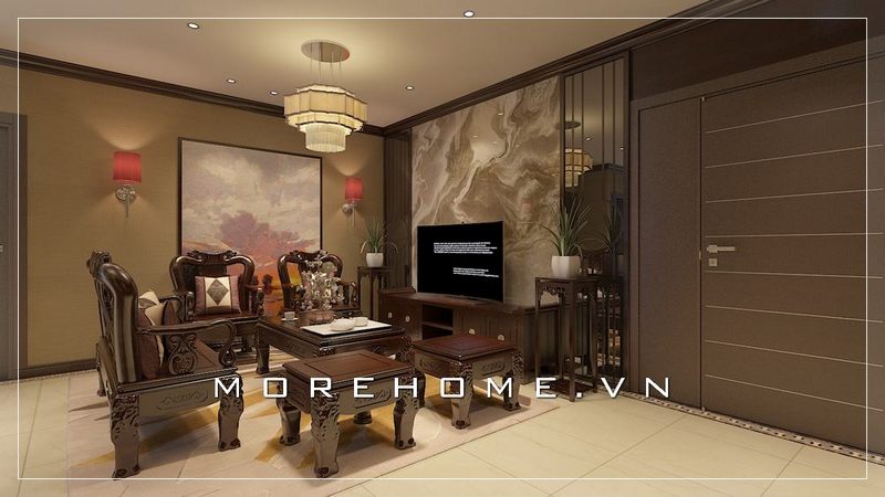 Ban thờ kết hợp trong không gian phòng khách đã giúp cho gia chủ giải quyết tốt về diện tích và không gian.