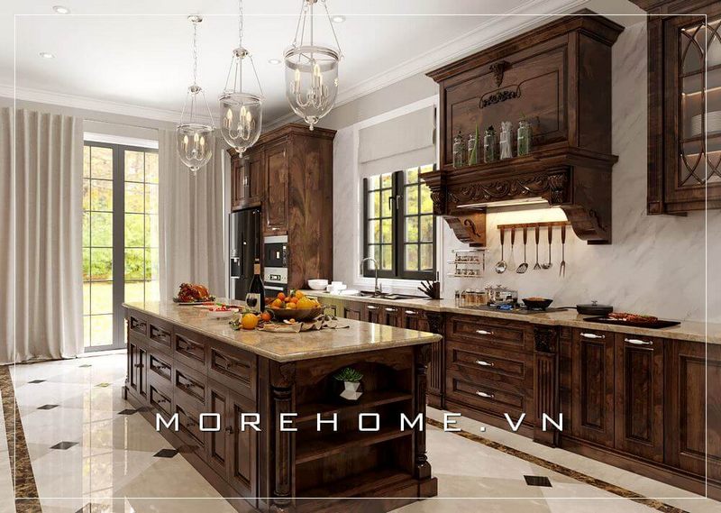 Khách hàng thường quan tâm và lựa chọn sử dụng bộ sưu tập mẫu tủ bếp gỗ óc chó của nội thất MoreHome để trang trí không gian biệt thự.