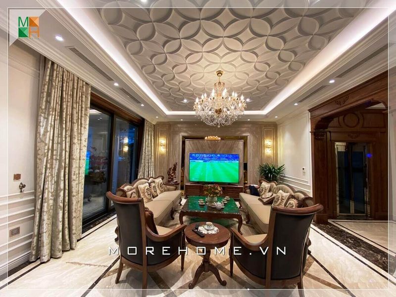 Phòng khách biệt thự có phong cách tân cổ điển đẹp và sang trọng, bạn nên không bỏ qua điều đó.