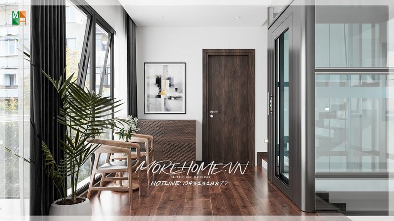Hành lang tầng rộng được bố trí thêm bàn ghế gỗ hiện đại nhỏ nhẹ làm nơi thưởng trà, thư giãn